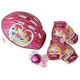 She'll be safe and adorable in this colorful Disney-themed bicycle gear for toddlers. The value pack includes a pink bike helmet and matching purple and pink knee and elbow pads adorned with Disney princesses Cinderella, Snow White, and Belle from Beauty and the Beast. The hardshell helmet, approved the U.S. Consumer Product Safety Commission, is made of tough ABS plastic (the same material used to make motorcycle helmets) and lined with EPS foam padding designed to hug the head and absorb impact should she take a fall. The helmet also features a built-in visor to protect young eyes and several large air vents to prevent overheating. The knee and elbow pads are made of soft, comfortable nylon and have durable plastic shells on the outside to guard against bumps and scrapes. The pads secure in back of knees or elbows with two Velcro tabs