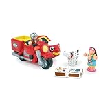 Motorbike Max from WOW Toys is the friction driven motorbike with realistic engine sounds that includes a sidecar and a back car. Also includes 3 removable charactersa mother with baby, a father, and a dogand a flip-open picnic basket. All parts are made from durable, PVC-free plastic, contain no sharp edges, and feature non-toxic paint. Box measures 13.5"x9.75"x8.25".